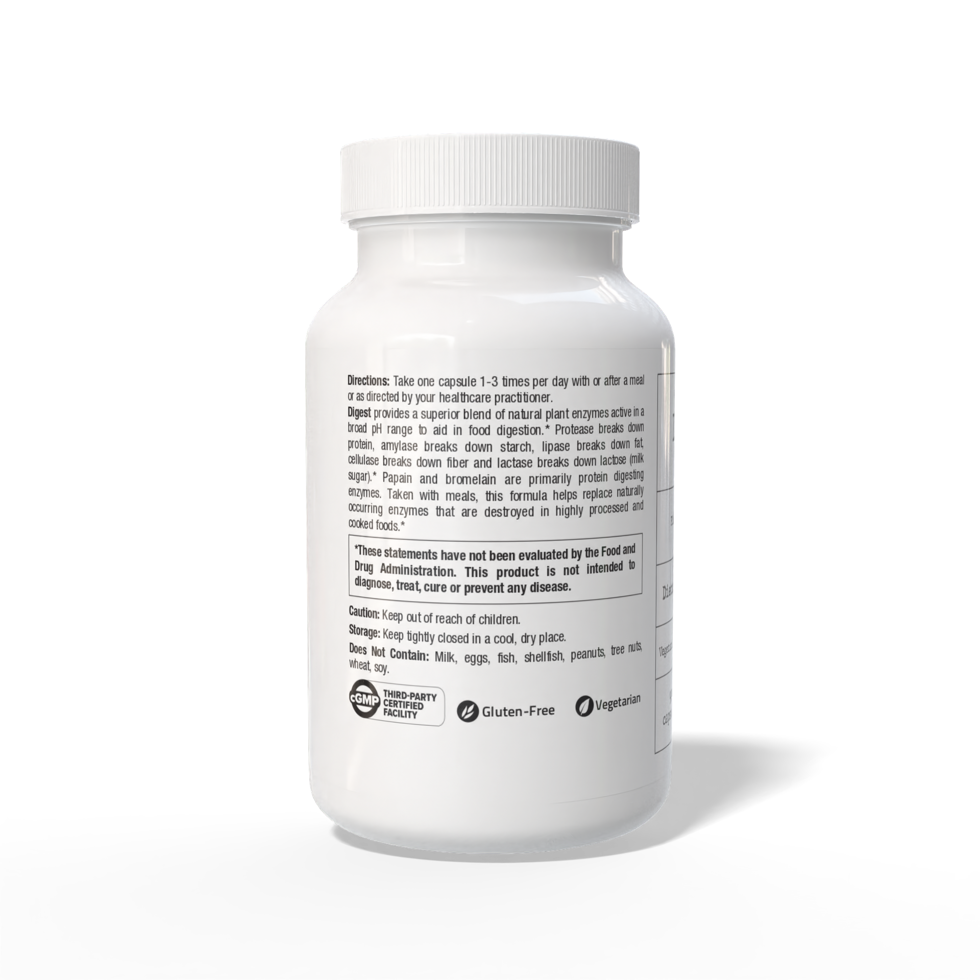 Digest is a comprehensive vegetarian digestive support formula featuring a powerful plant enzyme blend designed to promote optimal digestion and nutrient absorption. Each enzyme in this multi-spectrum formula is active across a wide pH range, supporting the breakdown of proteins, fats, carbohydrates, fibers, and dairy.